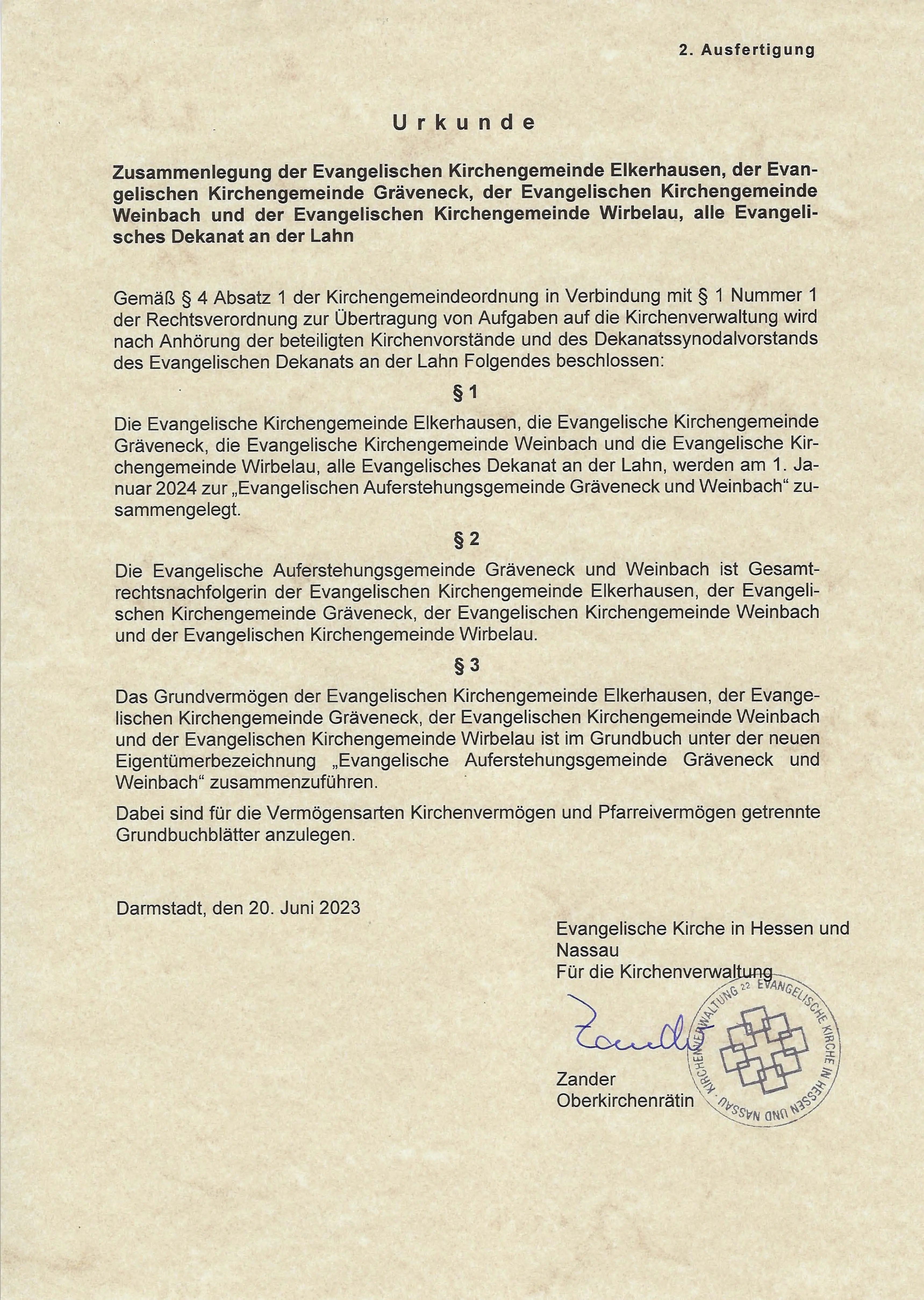 Die neue „Ev. Auferstehungsgemeinde Gräveneck und Weinbach wurde am 21.06.2023 durch die Kirchenverwaltung in Darmstadt genehmigt.