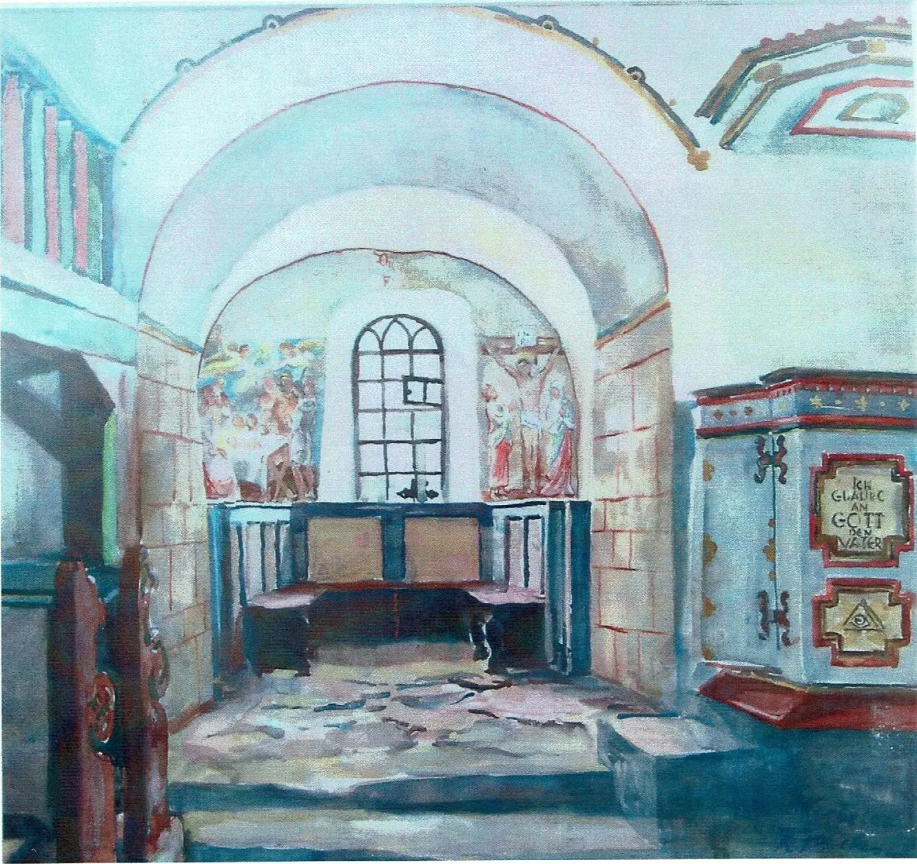 Das Gemälde, ein Aquarell von dem Maler Rudolf Fuchs, zeigt die Wirbelauer Kirche vor deren Renovierung im Jahre 1955. Auch die Wandmalerei stammte von Rudolf Fuchs. Bei der Renovierung wurde der Innenputz der Kirche abgetragen und erneuert. Damit ging auch die Wandmalerei verloren. Rudolf Fuchs starb 1985 im Alter von 93 Jahren.