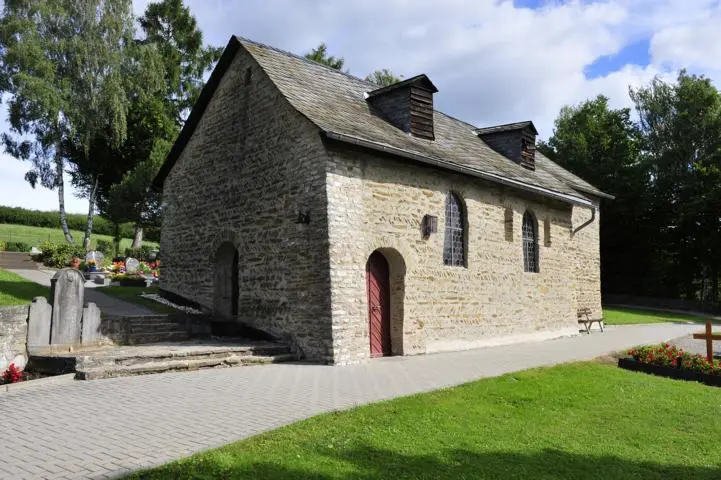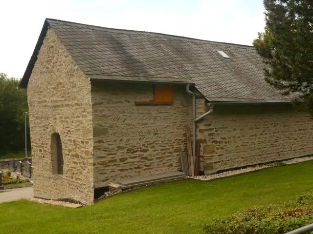Die Friedhofskapelle erhebt sich nordöstlich oberhalb der heutigen Ortslage auf einer Hügelkuppe. Sie besitzt den Grundriss eines Rechtecks, dem am Ostende ein etwas schma-lerer, annähernd quadratischer Chorbau angefügt ist. Ein verschiefertes Satteldach mit zwei Standgauben überdeckt Kirchenschiff und Chor. Auf der Südseite des Langhauses blieben noch zwei der ursprünglichen kleinen Rundbogenfensterchen erhalten, zwischen ihnen war – ablesbar am Mauerwerk – ein rundbogiges Portal, welches in späterer Zeit zugemauert worden ist. Die größeren spitzbogigen Fenster wurden höchstwahrscheinlich im späteren Mittelalter eingebrochen. Der einzige heutige Zugang liegt neben der Südwestecke der Kirche und ist wahrscheinlich erst in der Neuzeit eingebrochen worden. Auf der Westseite befand sich ein wieteres, heute zugemauertes Portal. Die gesamte Nordseite besaß kein einziges Fenster, jedoch ist eine kleinere, ebenfalls zugesetzte Rundbogenöffnung in deren westlicher Hälfte erkennbar. Ob das Rundbogenfenster in der Ostwand des Chores noch seine Originalgröße besitzt oder später vergrößert wurde, muss offen bleiben.