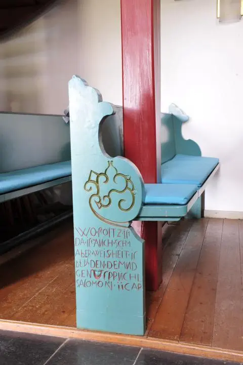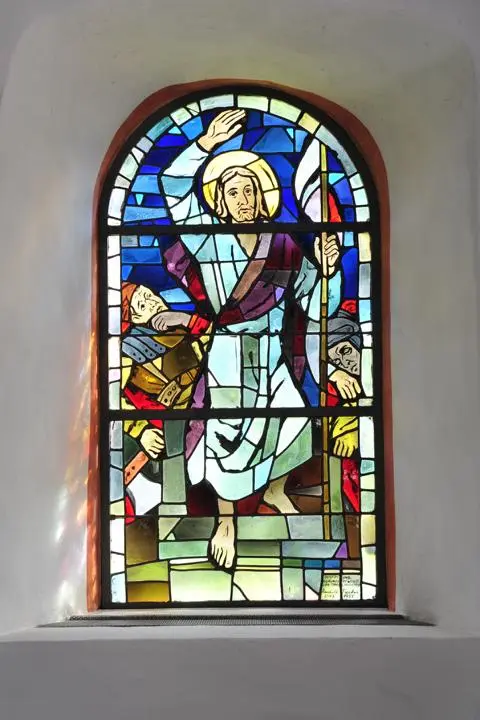 Der Rundbogen zum Altarraum ist durch eine graue Farbgebung mit hellen Fugenstrichen von den weißen Wänden abgesetzt. Dieser Anstrich ist zwar nicht original, greift aber zurück auf viele mittelalterliche Vorbilder, die hierdurch einen „höherwertigen“, aus gehauenen Steinquadern errichteten Bauteil vortäuschen wollten. Der Altar aus Eichenholz, den Werner Becker aus Wirbelau in den 50ern angefertigt hat, wurde 2013 durch einen Altar aus Wirbelauer Marmor ersetzt. Die Ausführung der Arbeiten übernahm die Firma Armin Klotz aus Weinbach. Der kleine hölzerne Tischaltar in der Mitte des Altarraums wird umgeben von Wandbänken, die ursprünglich als Sitzplätze der Honoratioren und Kirchenältesten dienten. Zwei Fenster belichten den Chor, eines in der Südwand, welches wohl im Spätmittelalter eingebrochen wurde, sowie das östliche Rundbogenfenster, das sehr wahrscheinlich original ist und höchstens vergrößert wurde. In ihm ist ein vielfarbiges Glasbild von 1955 eingelassen. Laut der Inschrift stammt es von dem Diezer Künster Rudolf Fuchs und wurde durch die Glaswerkstatt Gustav van Treeck in München ausgeführt. Die Darstellung zeigt die Figur des auferstandenen Christus mit der Siegesfahne in der Hand über dem offenen Grab. Über dem hellen Gewand hängt ein violettes Manteltuch, die Farbe erinnert an die vergangene Passion. Rechts von ihm ein noch schlafender Wächter, links ein weiterer Soldat, der erschrocken aufblickt, während seine Streitaxt nutzlos herabhängt. Der Schöpfer des künstlerischen Entwurfs, Rudolf Fuchs wurde am 03. Aug. 1898 in Diez geboren und besuchte nach dem Abitur die Kunstakademie München und war Schüler von Prof. Dr. Karl Becker. 1934/35 war er maßgeblich an der Freilegung und Restaurierung der Fresken im Limburger Dom beteiligt. Bis zu seinem Tod am 20.01.1985 arbeitete er als Kunstmaler und Graphiker, zudem entwarf er viele Fresken und Mosaike und schuf Buntglasfenster. Anlässlich seines 100. Geburtstags ehrten ihn die Städte Limburg und Diez mit zwei Ausstellungen. Insgesamt hat er circa 40 Kirchenfenster (zum Beispiel in der Jakobuskirche Freiendiez und der Marienkirche in Bad Homburg) gestaltet.