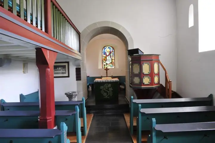 Das Innere der Kirche ist ein schlichter Saalraum mit Flachdecke, der durch einen runden Chorbogen zum tonnengewölbten Altarraum geöffnet ist. Ursprünglich besaß das Schiff eine Holzbalkendecke mit einem Unterzug, der von einer spätgotischen Deckenstütze getragen wurde. Stützpfeiler und Unterzug wurden leider bei der Renovierung von 1961/62 entfernt und die Decke glatt verputzt, jedoch kann man sich anhand der erhaltenen Balkendecke der ev. Kapelle im Nachbarort Gaudernbach noch ein Bild des ursprünglichen, spätmittelalterlichen Zustands machen. Den oberen Bereich der Stütze mit vier gekehlten Bügen blieb glücklicherweise erhalten und fand eine Zweitverwendung als Kanzelfuß.