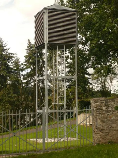 Ein aus Stahlträgern errichteter Glockenturm wurde im Jahre 2001 ca. 25 Meter westlich des Gotteshauses errichtet. Darin hängen zwei Glocken von 1920, die von der Glockengießerei Rincker in Sinn gegossen worden waren und ursprünglich in dem kleinen Dachreiter der alten Schule des Ortes ihren Dienst taten. Nach dessen Abriss im Jahre 1988 wurden sie erst eingelagert, bis sie auf den Friedhof kamen. Sie tragen die Inschriften „Ehre sei Gotte in der Höhe“ und „Friede auf Erden“.