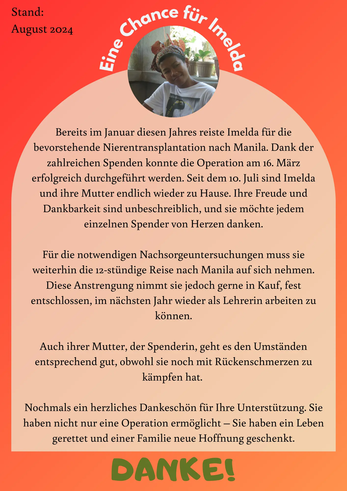Imelda wird eine Niere von ihrer Mutter erhalten und muss dazu für einige Monate im 10 Busstunden von ihrem Wohnort entfernten Krankenhaus in Manila unterkommen. Die Gesamtkosten für die Transplantation und die Folgebehandlungen belaufen sich auf etwa 35.000 Euro. Jede noch so kleine Spende, die auf ein Konto der Ev. Auferstehungsgemeinde Gräveneck und Weinbach überwiesen werden kann (Verbindung siehe rechts) und für die es auch Spendenquittungen gibt, werden Imelda helfen, ein eigenständiges Leben nach der Transplantation führen zu können.