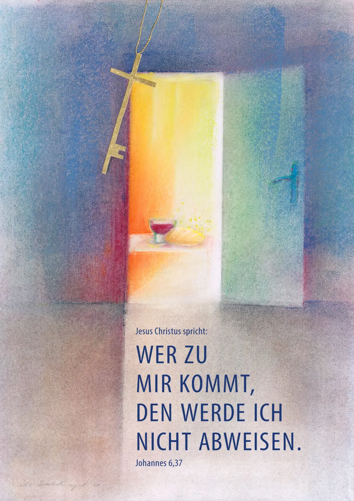 Bleibt die Tür offen oder fällt sie irgendwann ins Schloss? Ein überdimensionaler goldener Schlüssel in Form eines Kreuzes baumelt an einer Kette von oben herab. Das Kreuz als Schlüssel zum Leben … Beim genaueren Hinsehen entdecke ich auch auf dem Brot ein zartes goldenes Kreuz. Ebenso könnte das Rot des Weines im Kelch mit dem Rot am linken Türrahmen korrespondieren.
